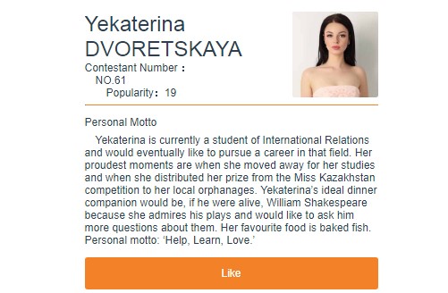 Первая вице-мисс Казахстан-2017 Екатерина Дворецкая родом из Караганды. Ей 20 лет, и она является студенткой третьего курса Университета международных отношений и мировых языков имени Абылай хана. Вот уже две недели девушка находится в Санье. Вместе с другими красавицами со всего света она поучаствовала в различных показах, спортивных и социальных мероприятиях. Им также провели экскурсию по достопримечательностям острова.