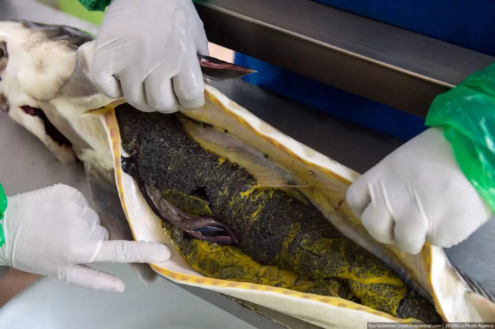 Потом рыбку протыкают специальной трубкой и достают несколько икринок, чтобы проверить качество. Если все хорошо, рыбу готовят к разрезанию.