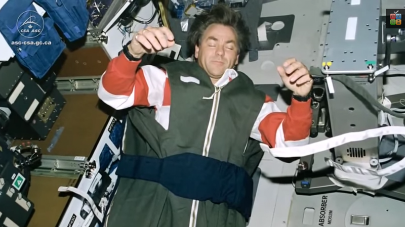 В видео "Как спят в невесомости?" Хэдфилд рассказал, что космонавты отдыхают в специальных спальных камерах, внутри которых есть спальный мешок, привязанный к стене.