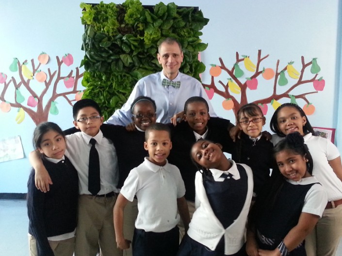 Стивен Ритц на фоне его изобретения - "зеленой стены", которая позволяет выращивать салат и другую зелень прямо в классе. © Green Bronx Machine