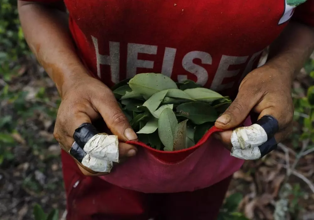 Пальцы рабочего Уолтера Переза перевязаны, чтобы не пораниться во время срезывания листьев коки с веток.