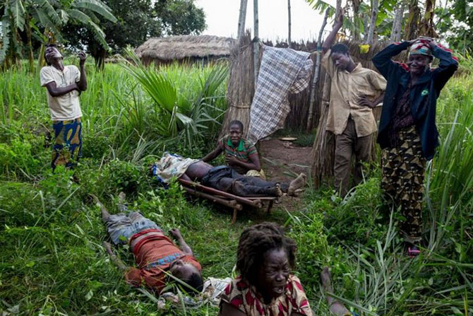 Мужчина, выживший после вооруженного нападения, теряет сознание возле морга, куда привезли тела его погибших родственников, в Банги.