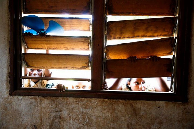 Дети выглядывают из мечети в мусульманском анклаве Begoua, 27 марта 2014 года. Около двух тысяч мусульман, в основном представителей народа фула, нашли пристанище возле мечети.
