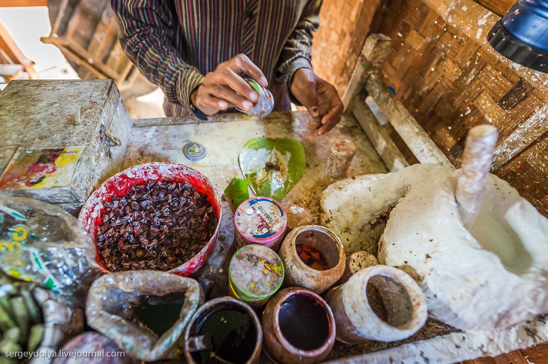 Бетель тут употребляют примерно так же, как в Южной Америке листья коки. Их жуют вместе с гашеной известью, которая позволяет веществам содержимого всосаться в кровь.
