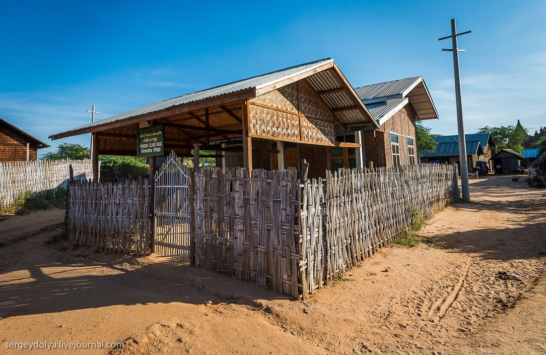 Пройдемся по бирманской Барвихе дальше. Это медицинская клиника. Пару лет назад японские туристы посетили эту деревню, а после, скинувшись, построили в ней клинику. Причем не только в этой деревне, а и в четырех соседних. Правда, врач всего один на все пять клиник. Поэтому он работает по одному дню в неделю в каждой из больниц. Все жители уже знают, в какой день недели врач будет у них в деревне.
