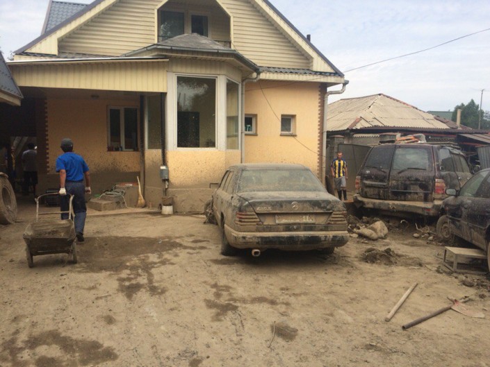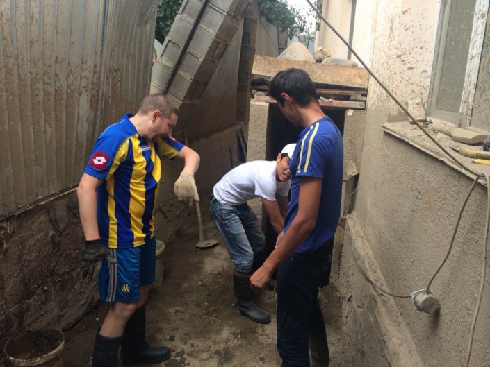 Журналисты и сотрудники сайтов Tengrinews.kz, Vesti.kz, Massaget.kz и Tengri FM также решили откликнуться на зов о помощи и приехали потрудиться в пострадавший район. В штабе нам выдали необходимые инструменты и направили в один из сильно пострадавших домов.