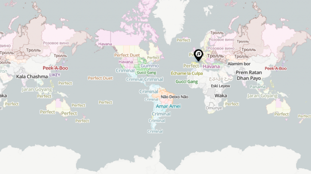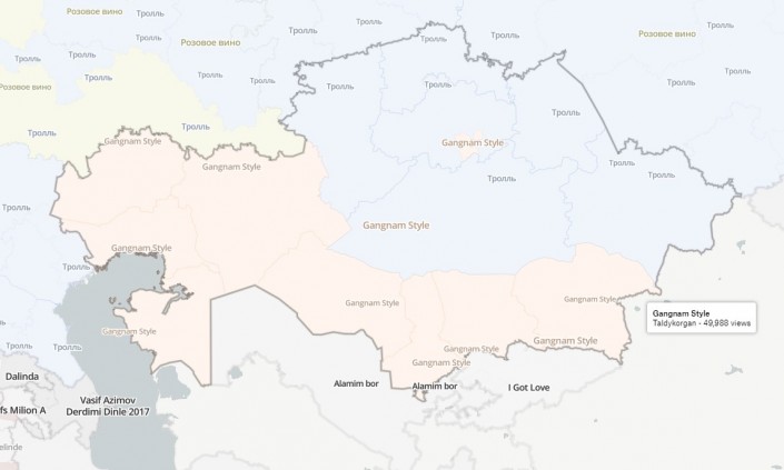 Карта, опубликованная сайтом визуальных эссе The Pudding, собрала песни, занимающие первые строчки чартов в трех тысячах городов мира, по данным из Youtube. Она позволяет увидеть самые популярные треки в каждом из населенных пунктов в день проведения эксперимента - 17 декабря 2017 года. К примеру, почти во всем Казахстане в тот день лидирующую строчку занял трек PSY - Gangnam Style, "взорвавший" мир в 2012 году. Эта песня о богатом районе Каннамгу (Gangnam-gu) в Сеуле, Южная Корея, где часто проводят досуг молодые мажоры - дети богачей.