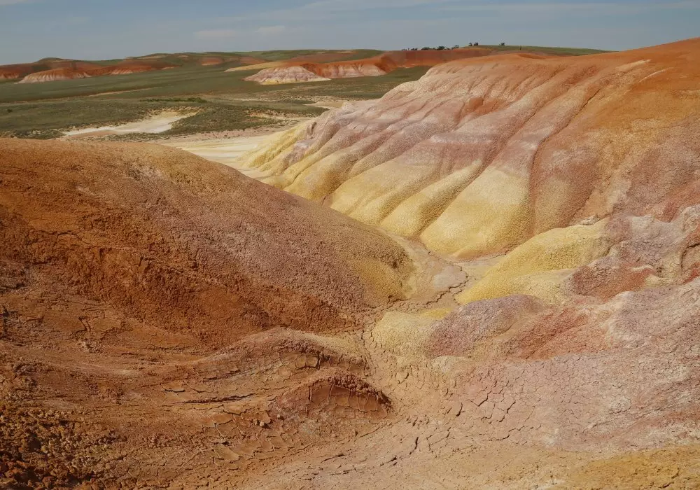 Живописные горы мелового периода, именуемые Акжар (или Акжал), являются по-настоящему марсианскими. Они представляют собой небольшой массив, состоящий из невысоких сопок желто-красных оттенков и резко контрастирующий с окружающей его степью. Горы сформированы суглинистыми почвами с примесью гипса (по верхам сопок в изобилии встречается кристаллический гипс). А еще на территории массива можно найти весьма обширные пещерки, в которых располагаются гнезда больших хищных птиц.