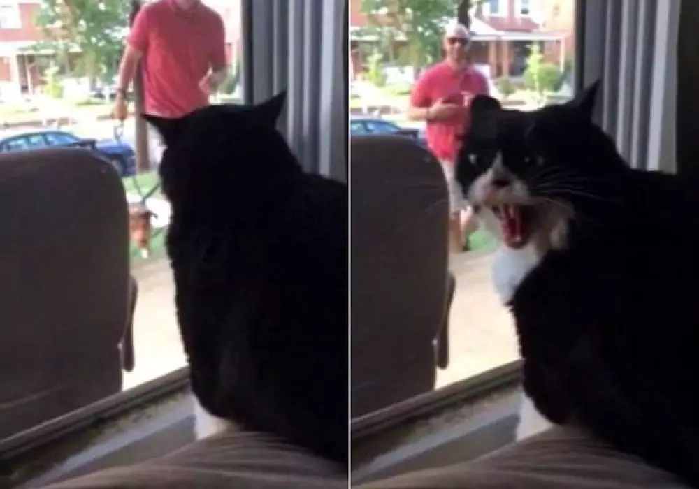 Знакомьтесь, этого пушистого бедолагу зовут Като, и он крайне недоволен тем, что его хозяин привел домой собаку. Като сидел у окна в ожидании своего хозяина, но как только он увидел, что тот вернулся домой не один, а с собакой, на него напал дикий ужас. Кот начал истерично кричать во весь голос, всем своим видом выказывая отвращение ко всему происходящему. Тише, киса, теперь это твой новый друг.