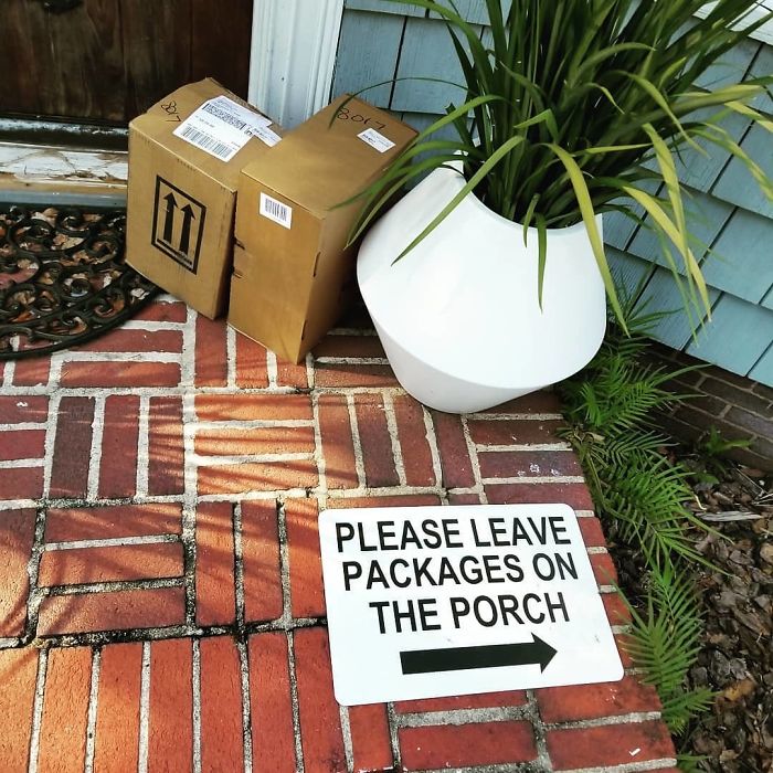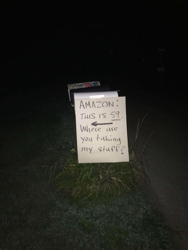 # 18 После того как трижды почтальон доставил посылки соседям, которые, к слову, отказались их возвращать, глава семьи оставил эту надпись: "Это дом № 59. Куда вы приносите мои вещи?"
