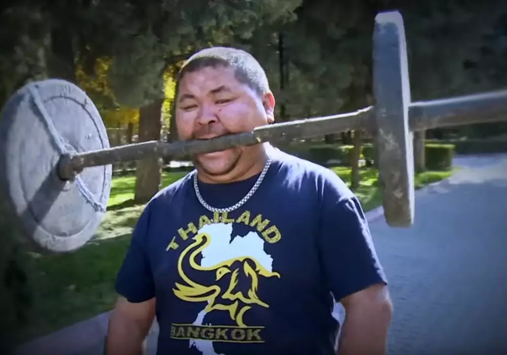 На следующее утро к Нурлану, гуляющего со своей женой в парке, обратился незнакомец, спрашивая, что он умеет делать. Он в ответ спросил, сколько тот весит. Оказалось, 65 килограмм. Тогда Алишеров вдруг ответил, что сможет поднять парня за ремень зубами с земли с делать прогиб.