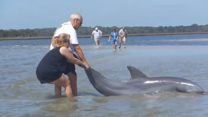 Эти двое вытащили дельфина весом примерно 135 кг из песчаной косы, где ее выбросило на берег. В воде маму ждал малыш, они счастливо уплыли вместе.