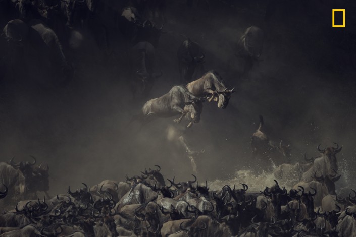 "Было раннее утро, когда я увидел гну, пересекающих реку Мара в Танзании. Слои пыли, тени и солнце над хаосом животных в воде придают этой картине ощущение таинственности и очарования. Это почти как старая картина: я все еще вынужден искать детали изображения, чтобы осознать эту нереальную сцену