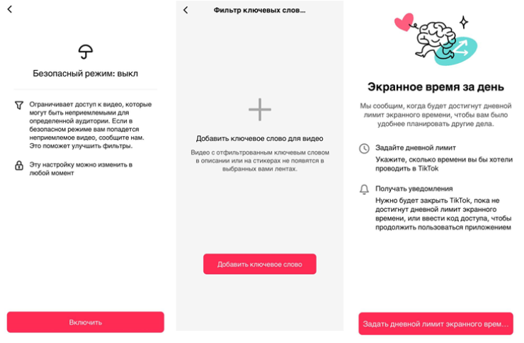 Но также лимиты можно установить на каждой из популярных соцсетей. Например, TikTok предлагает целый ряд инструментов для поддержания цифрового благополучия пользователей. Ключевыми инструментами платформы в этом направлении являются: