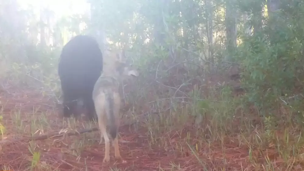 В американском штате Флорида скрытая камера сняла момент, как медведь и койот гуляют вместе по лесу. Совместная прогулка этих двух совершенно разных животных удивила как владельца камеры, так и комиссию по охране природы.