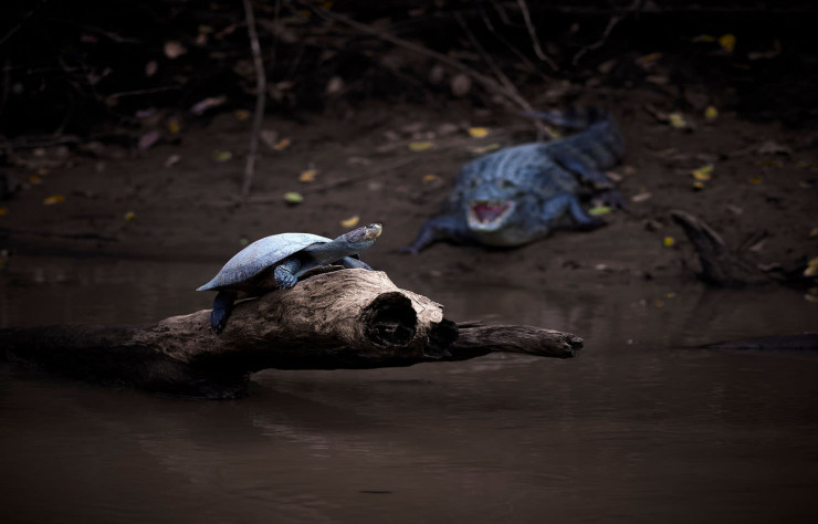"Я был в поездке с известным фотографом Игнасио Паласиосом, путешествуя по Боливии и Атакаме в Чили. Как пейзажисту, фотографировать животных в крохотной лодочке в середине дня для меня было некомфортно, но тем не менее это было великолепное развлечение. Буквально сотни аллигаторов накрыли берег, когда стало жарко. А черепахи искали бревно или камень, чтобы погреться на солнышке. Черепаха на снимке едва не стала закуской аллигатора, но успела спрятаться в свой панцирь", - отмечает Чарльз Джонс.