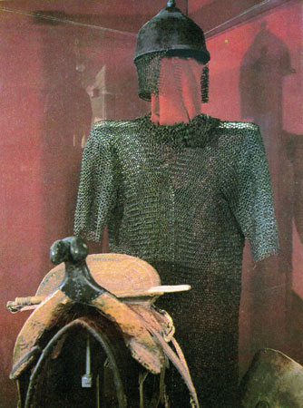 Защищали воинов щит "калкан", доспехи "сауыт" и шлем "дулыга". Последние были самыми разнообразными по своей форме - с козырьком и насечкой серебром, с сеткой и кожаным орнаментированным чехлом.