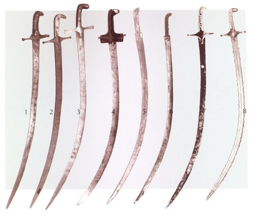 К режущему оружию относятся прямой меч - "семсер", кривая сабля - "кылыш" и казахская шашка - "сапы".