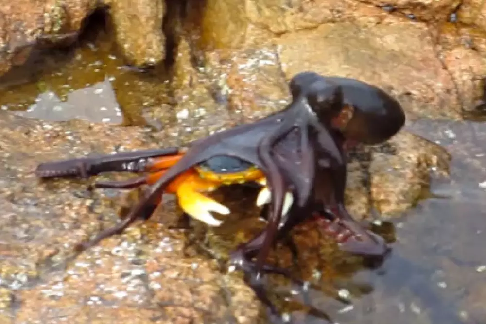 Атака осьминога произошла в Западной Австралии. Автор ролика без особой цели снимала на камеру прогулку краба, когда из воды выскочил осьминог и завязалась драма. Крабы являются важнейшим элементом рациона осьминогов, говорят биологи.