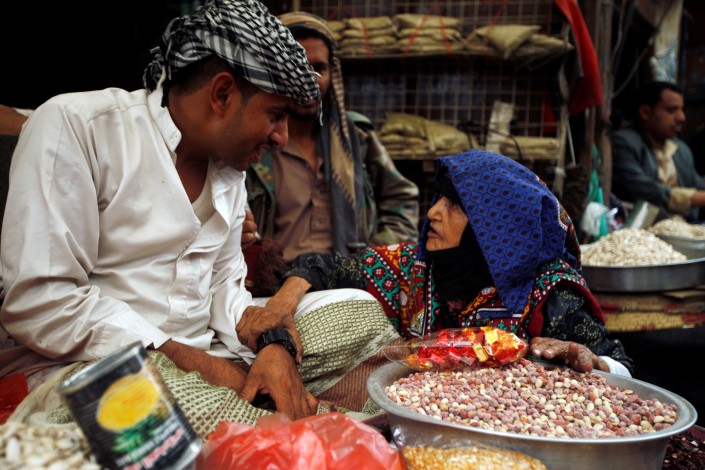 Женщина пришла на рынок, чтобы купить продукты для праздничного стола. Сана, Йемен.