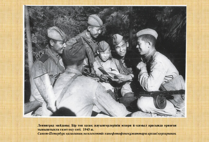 Мына суретке ресми берілген атауында "Ленинград майданында, бір топ қазақ жауынгерлерінің әскери іс-қимылдар арасында орнаған тыныштықта газет оқу сәті" делінген. Өкінішке қарай, жауынгерлердің аты-жөні көрсетілмеген. Жас шамаларына қарағанда мақаламыздың кейіпкері Ратаев Рақыштың құрдастары болып келер. Сонымен қатар, олар газетпен бірге туған жерден келген хаттарды оқып, қуаныштарымен бөлісіп отырғандай сезім береді. Осы суреттен аталарын, бауырларын танып жатқан оқырмандарымыз болса, ол кісілердің хабарласуын өтінеміз.