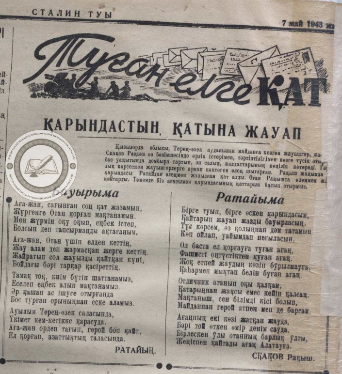 Архивтегі кезекті бір жоба бойынша қажетті деректерді іздестіру барысында, "Сталин туы" атты майдан газетінің 1943 жылғы сандар жиынтығын қарап отырып, "Туған елге қат. Қарындастың қатына жауап" атты мақалаға көзім түсті.