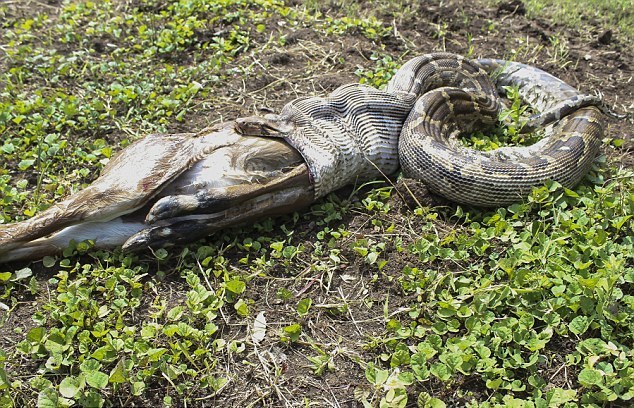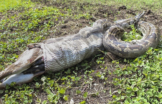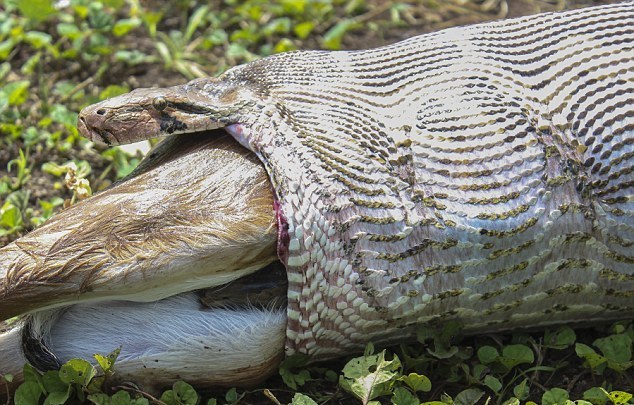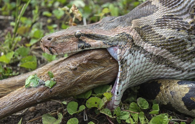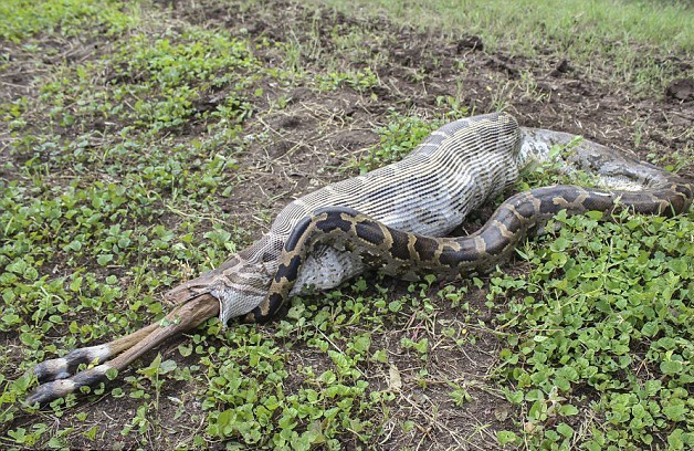 Когда люди столпились вокруг питона, он выпустил практически полностью проглоченную жертву.