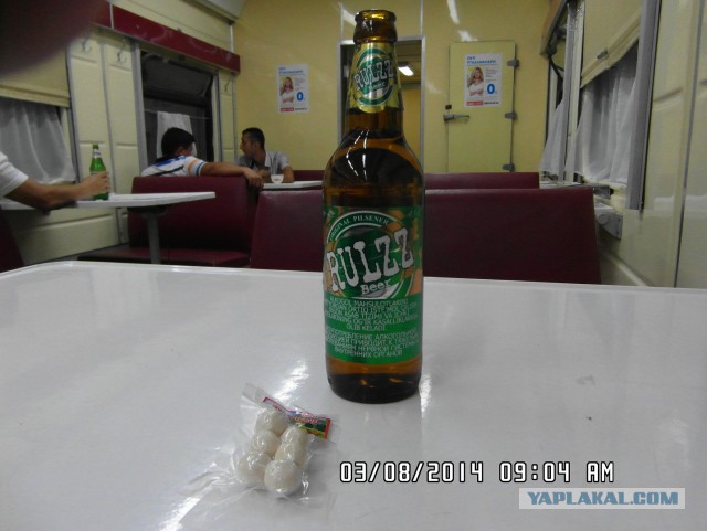 Пиво местное, интересно, раньше, конечно, такого не видел. На вкус прилично (это и в отзывах не оспаривается), стоимость в вагоне-ресторане около 50 рублей на российские деньги. Закусить взял три шарика курта (соленого сушеного творога).