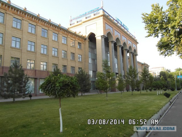 Ошхона, то есть столовая, за какие-то копейки предложила лагман, фото выкладывать не буду. Погода отличная. В прошлом году везде было холоднее, чем обычно. Но их холод - это в августе наше реальное лето, красота. Никакой дикой жары, адекватная температура под 30 градусов. Переносится легко. В кассе поинтересовался насчет билетов. Оказалось, их нет! Я подумал остаться в Ташкенте, но потом обратился в другую кассу. Оказалось, билет есть, один СВ. Мне не предложили ввиду того, что он очень дорогой, около 200 000 сум, или 70 долларов. Да я в Ташкент на плацкарте за эти деньги приехал, прикинув в уме, билет взял и покинул здание вокзала. Естественно, из-за мер безопасности нет бомжей, попрошаек и прочих приставучих личностей. В пределах одного часа решил осмотреть окрестности. Чисто. Улицы очень широкие. Полиция на каждом углу, но не напрягает. Было воскресенье, людей мало. Вот здание "Узтелекома".