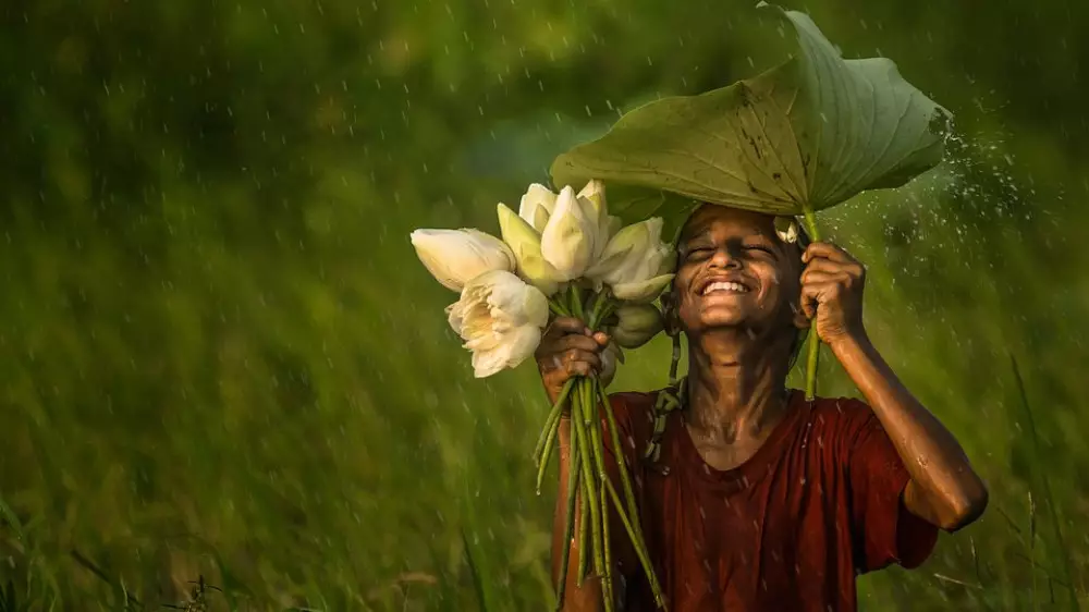 "Был солнечный день. Планировал пойти и сделать несколько фотографий. Я заметил этого мальчика, срывающего цветы, и через несколько мгновений пошел дождь. У него была большая и чистая улыбка, будто его ничего не беспокоило. Для меня счастье - это один из результатов правильной веры. Вера приносит вам уверенность, а уверенность дает вам энергию. И когда вы чувствуете энергию, вы неосознанно улыбаетесь", - делится победитель.