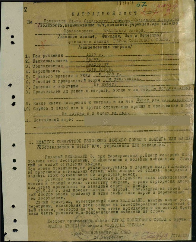 Умело маневрируя и используя все возможности военной техники, Закария справился с задачей. Отважному рядовому удалось первым перебросить десант, технику и продовольствие через Днепр.