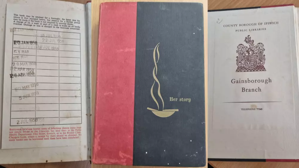 Читатель взял копию произведения "Любящая пара" Вирджинии Роуэнс в твердом переплете из библиотеки в поместье Гейнсборо в городе Ипсвич - центре графства Саффолк - и должен был вернуть книгу к 30 июля 1958 года.
