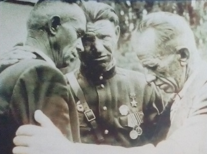 После долгих проверок Шадрина в 1947 году пригласили в Кремль, где ему была вручена Звезда Героя Советского Союза. После возвращения из Москвы ему вернули дом, он женился на фронтовой подруге Анне Кононовне. Не раз были встречи с однополчанами. В музее школы № 74 хранятся документы из его личных архивов. Вот одна из фотографий, где Шадрин с однополчанами Илларионом Васильевым и Григорием Шемякиным.