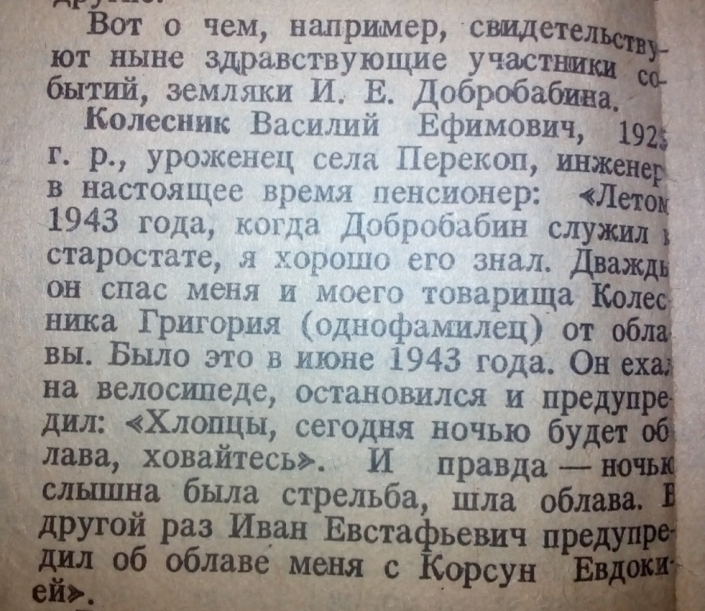 В 1989 году в Казахстане был снят документальный фильм "Подвиг и подлог". Журналисты побывали в селе Перекоп. В то время здесь еще было немало людей, которые пережили немецкую оккупацию. Они рассказали, как Добробабин спасал людей. Предупреждал их об арестах, облавах, готовил им поддельные документы. Он был своим среди чужих.