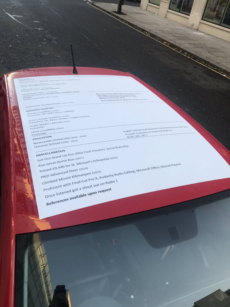 Блогер Макс Фош из Лондона, Великобритания, придумал, как сделать так, чтобы руководители телерадиовещательной организации BBC запомнили его резюме. Для этого он распечатал резюме на крыше автомобиля и припарковался на территории компании.
