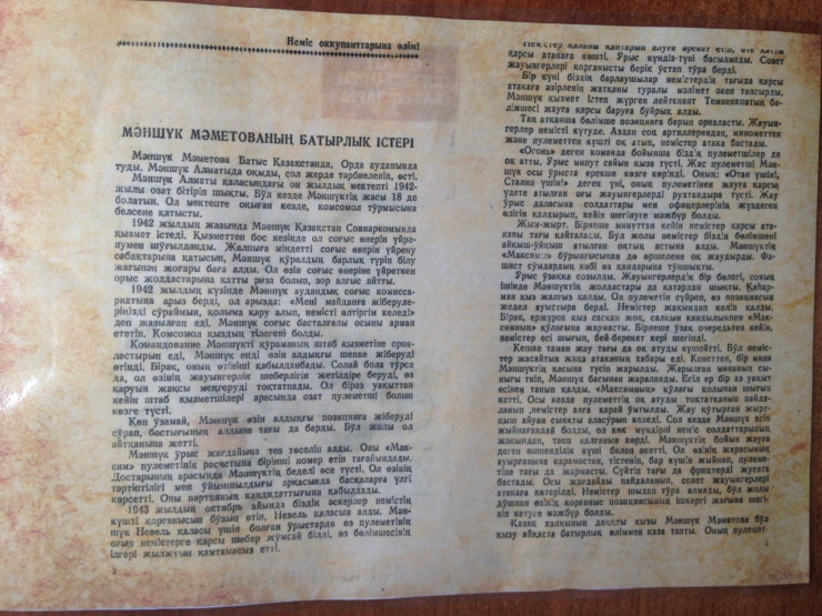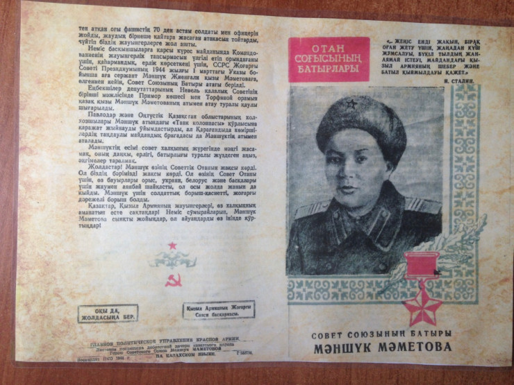"Руководитель музея Лилия Геннадьевна Арциховских представила нашей делегации подробный рассказ о подвигах казахских воинов и представила листовку на казахском языке, выпущенную на газетной бумаге в 1944 году главным политическим управлением Красной армии. Она посвящена Герою Советского Союза Маншук Маметовой. На листовке надпись: "Прочти и передай другому!", - рассказал Толешов.
