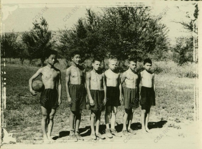 Командное фото перед товарищеским матчем. Пионерский лагерь Семипалатинского обкома профсоюза медработников, 1957 год. Из фондов Центрального государственного архива Республики Казахстан