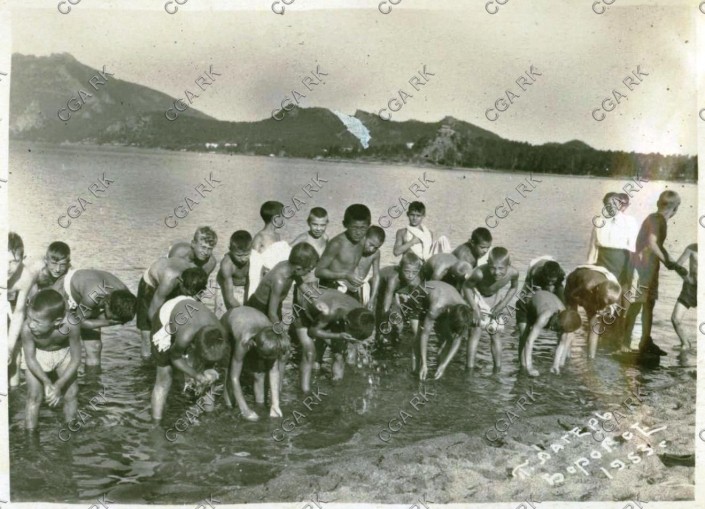 Прием водных процедур. Пионерский лагерь Кокшетауского обкома профсоюза медработников, 1955 год. Из фондов Центрального государственного архива Республики Казахстан