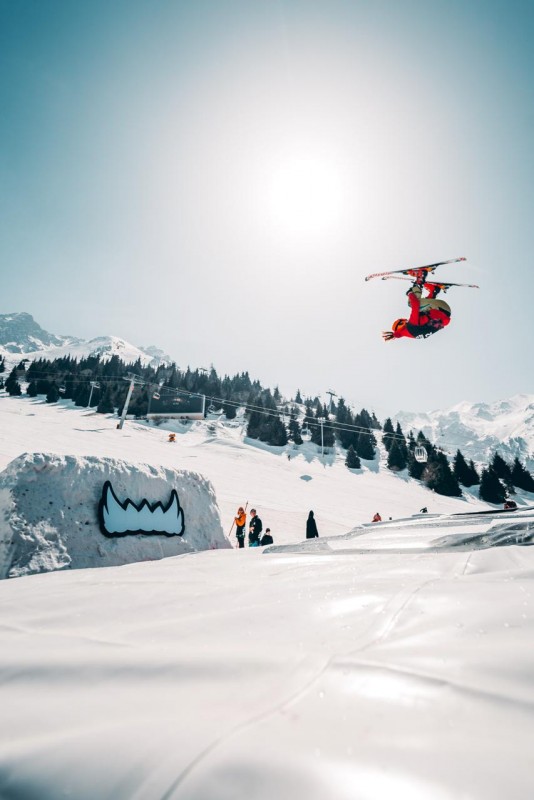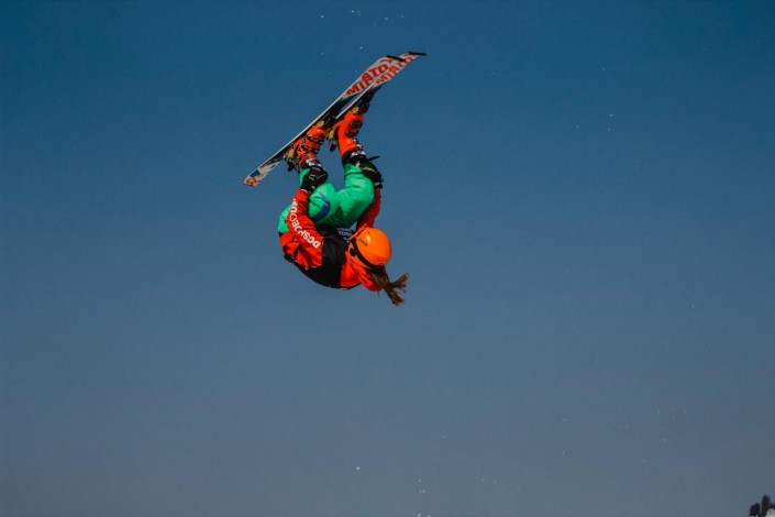 Еще спортсменка проделывает на лыжах крутые трюки.