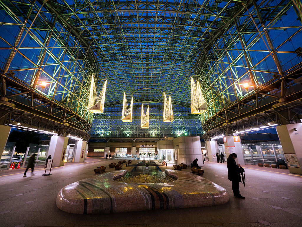 Первое время местные жители были несколько встревожены слишком современным дизайном входа на вокзал Канадзава. Деревянные колонны ручной работы и стеклянный купол в виде зонтика как бы сталкивались с традиционной архитектурой старого городского дворца (лучше всего сохранившегося во время войны), в котором в 2005 году разместился сам вокзал. Однако вскоре станция стала так популярна среди фотографов и туристов, что полюбилась и скептикам, вдруг увидевшим всю красоту постройки. Полюбовавшись центральным футуристическим входом, обогните вокзал и пройдите до его конца, где вы найдете фонтан, который к тому же еще и показывает время. Это Япония.