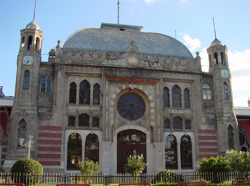Построенное в 1890 году в качестве конечной станции поезда Orient-Express, идущего из Парижа, это здание в османском стиле модерн особенно привлекательно своим фасадом. Полоски красного кирпича окружают широкий вход, а красочные витражи на окнах создают брызги цвета внутри здания. Несмотря на то, что этот главный вход теперь уже не используется, люди частенько останавливаются перед ним, чтобы полюбоваться строением, а может, и застать случайное выступление дервишей, кружащихся внутри большого зала.
