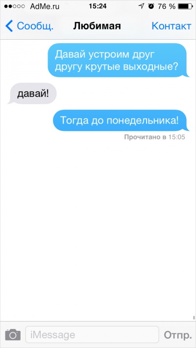 В век мобильных телефонов SMS-сообщения стали неотъемлемой частью нашей жизни. С помощью гаджетов стало намного проще документировать забавные моменты из жизни и делиться ими в Интернете. Сайт AdMe.ru собрал SMS, которые могли отправить друг другу только самые близкие люди - мужья, жены или возлюбленные. Читайте и узнавайте себя.