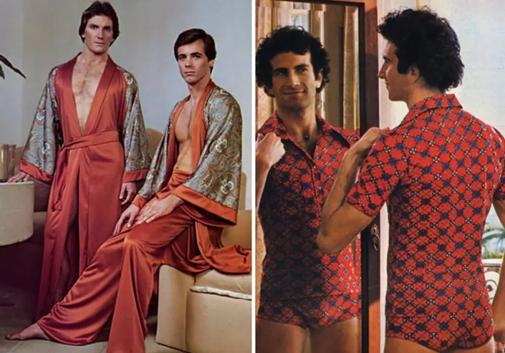 Эти фотографии мужской моды из каталога 1970-х годов пестрят яркими цветами, узорами, расклешенными брюками с завышенной талией и огромным разнообразием трикотажа. Именно в 70-е стремительно упали цены на синтетику, и мужчины бросились наряжаться.