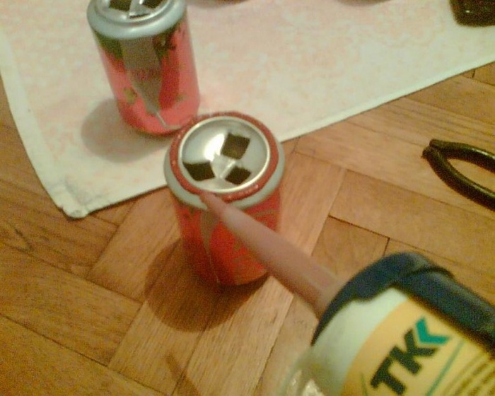 Вместо этого, вы можете использовать специальные инструменты или большие крестовые отвертки. Верхняя часть банки режется ножницами и изгибается так, чтобы получился "плавник". Его миссия заключается в содействии турбулентному потоку воздуха, чтобы собрать как можно больше тепла от нагретой стенки банки. (Просьба соблюдать технологию!) Все это необходимо сделать до склеивания банок.