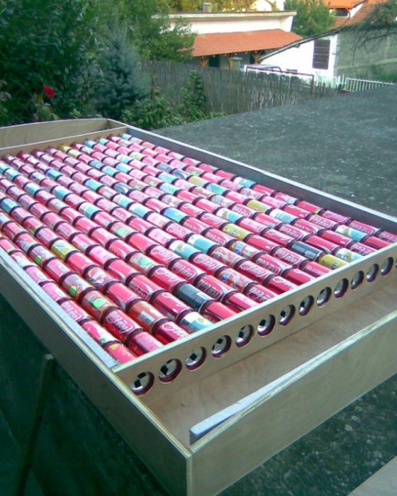 Корпус для солнечного коллектора выполнен из дерева (фанера 15 миллиметров), а его передняя панель из оргстекла/поликарбоната (вы можете также использовать обычное стекло), толщиной 3 миллиметра. На задней части корпуса установлена стекловата или пенопласт (20 миллиметров) в качестве изоляции. Гелиоприемник сделан из пустых банок из-под пива или других напитков, которые окрашены матовой черной краской, устойчивой к высоким температурам. Верхняя часть (крышка) банки специально разработана для обеспечения большей эффективности теплообмена между воздухом и поверхностью банки. (Просьба соблюдать технологию!)