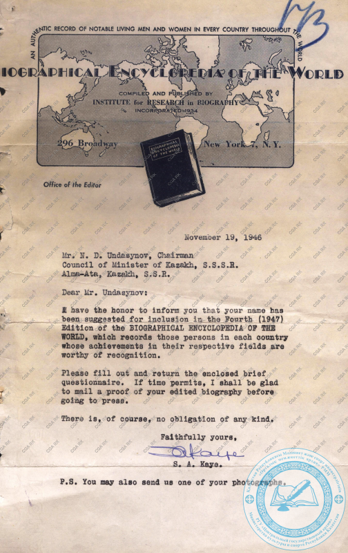 Но в архивных фондах есть один документ – это письмо редакции Мировой биографической энциклопедии (США, Нью-Йорк), поступившее дважды, в 1946 и 1947 годах, на имя председателя СНК Казахской ССР Нуртаса Ундасынова с просьбой прислать его автобиографическую справку с фотокарточкой с целью включения ее в это издание.