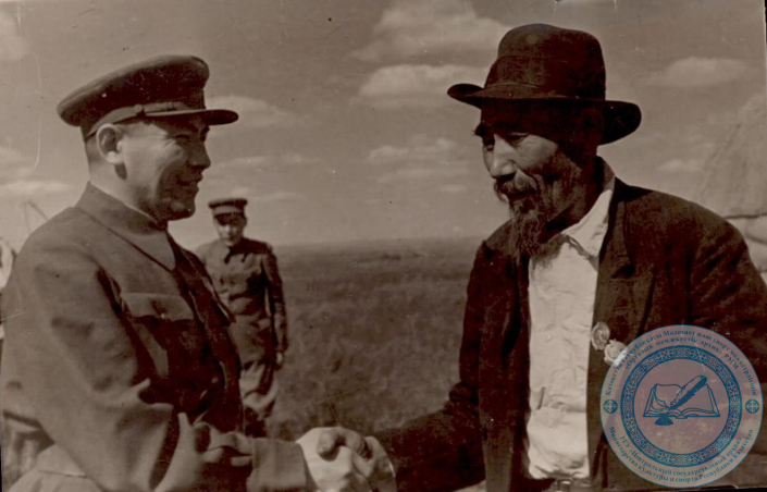 Н. Ундасынов и знатный просовод Ш. Берсиев. 1943 г. Из фондов ЦГА МКС РК.