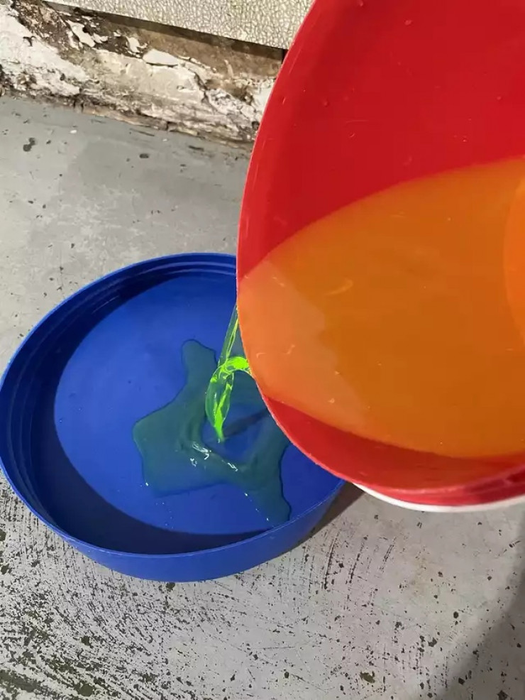 Жидкость в красной емкости выглядит оранжевой, а в синей - флуоресцентной зеленой. При переливании жидкости из синей тары в белую можно увидеть, что цвет продолжил меняться в зависимости от оттенка самой емкости.