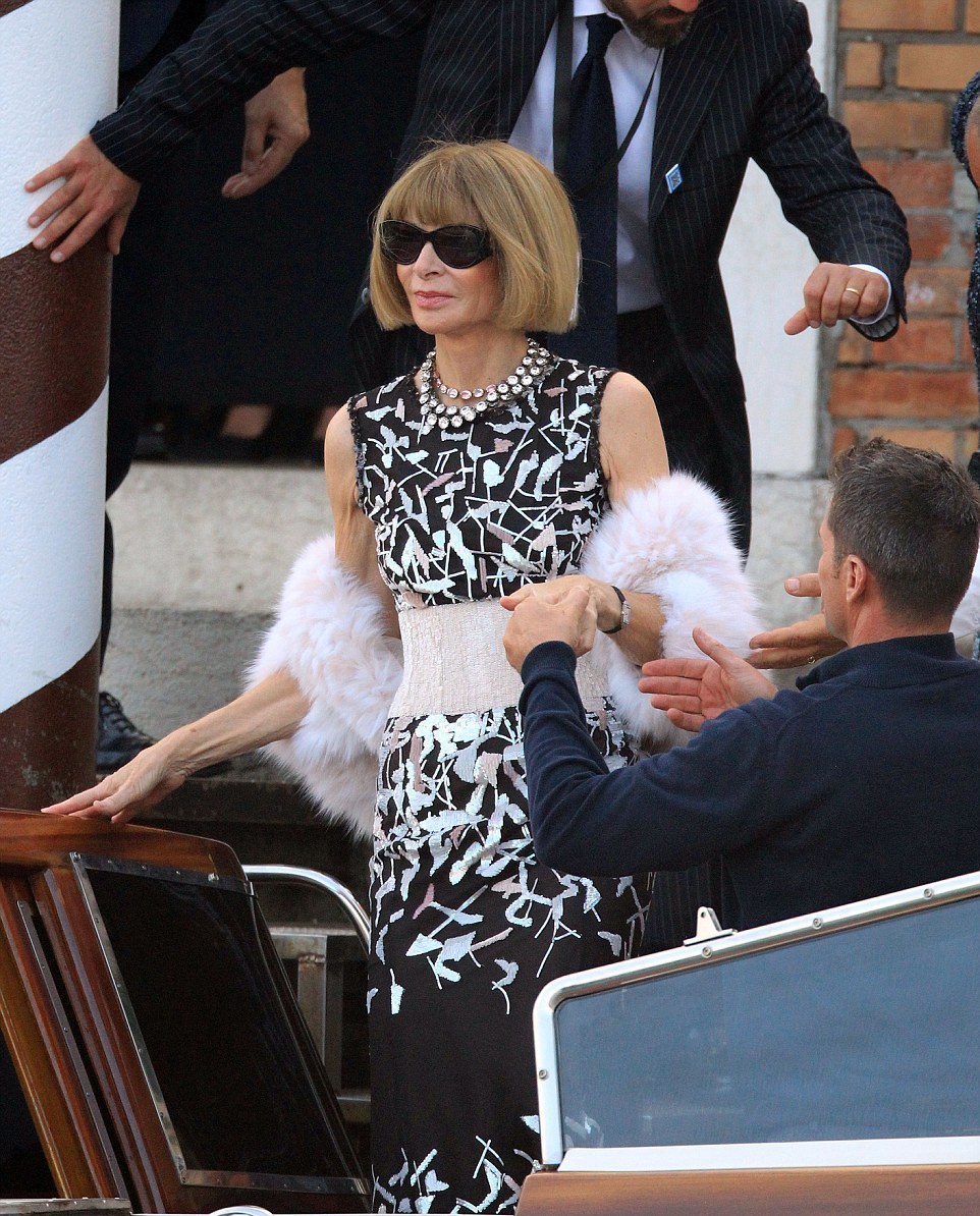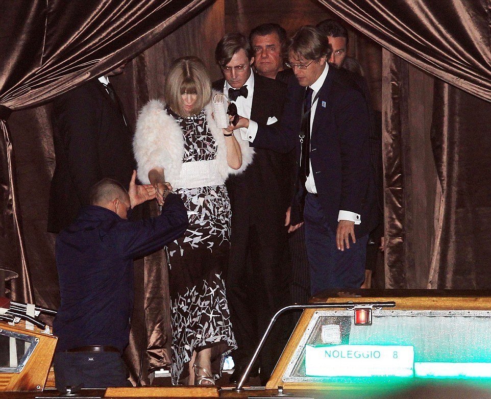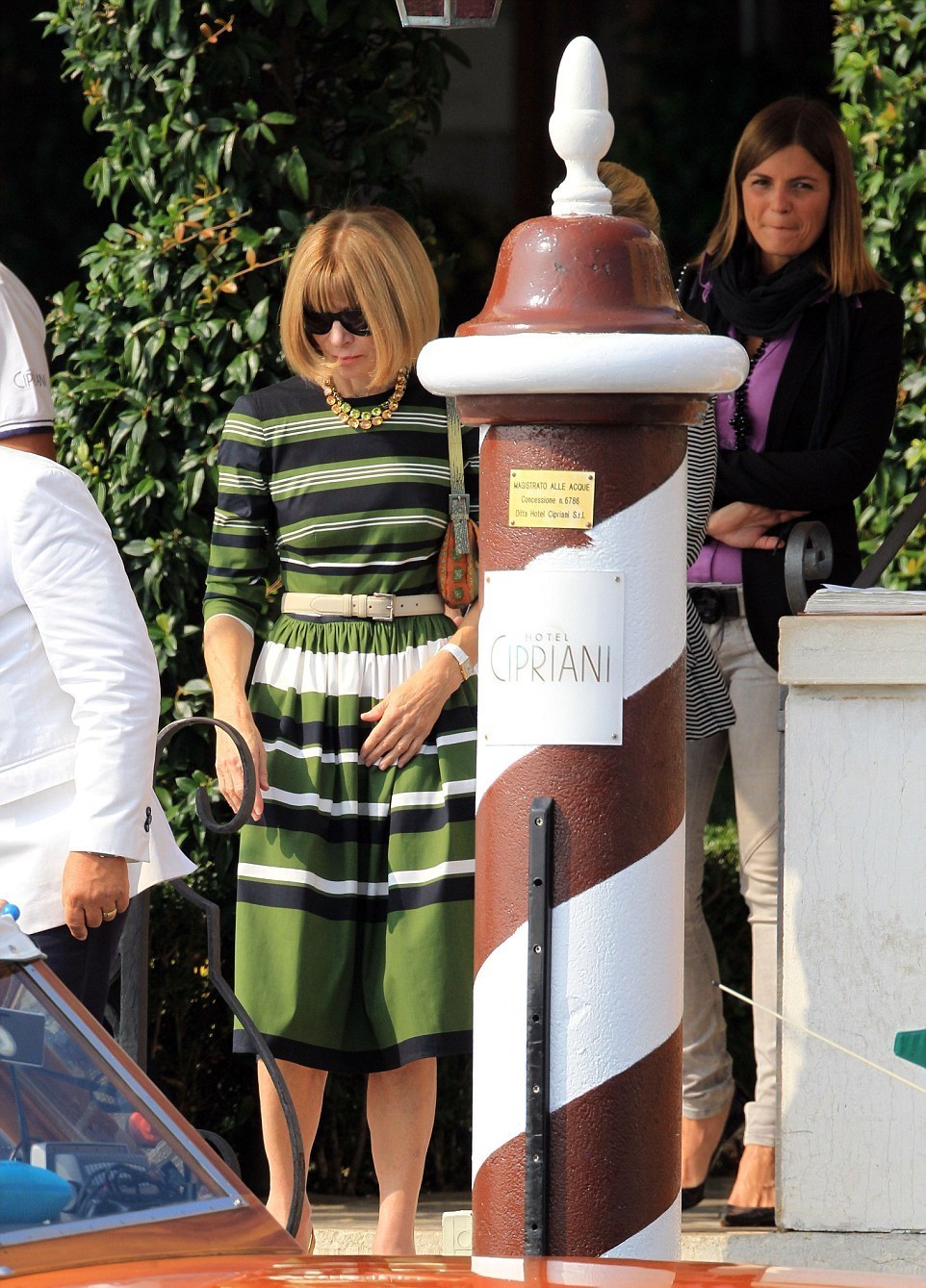 Главный редактор журнала Vogue выходит из отеля Cipriani.