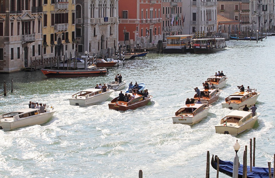 Пара и гости свадьбы, а также многочисленные фотографы передвигались по городу на скоростных катерах.